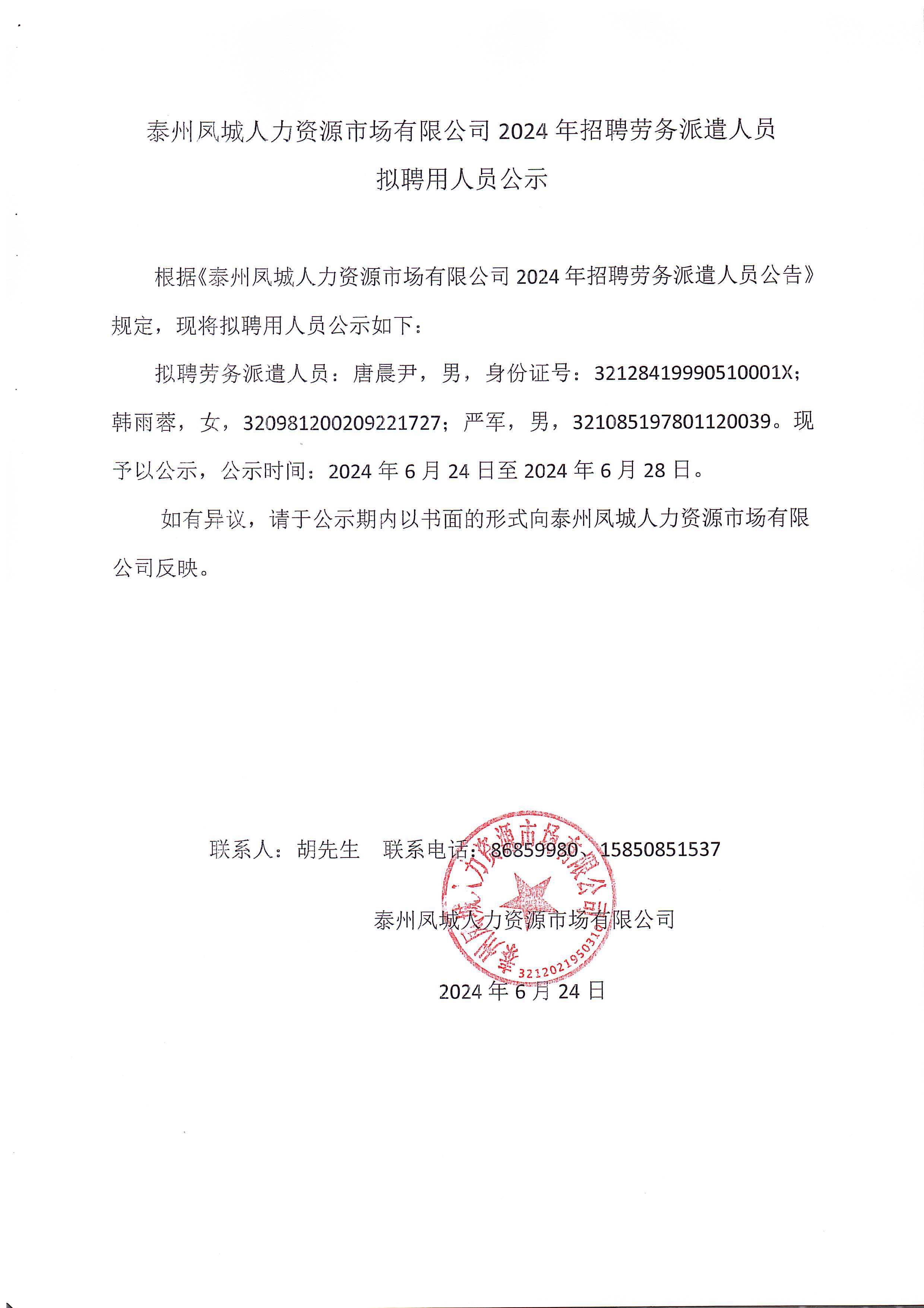 泰州鳳城人力資源市場有限公司2024年招聘勞務(wù)派遣人員 擬聘用人員公示