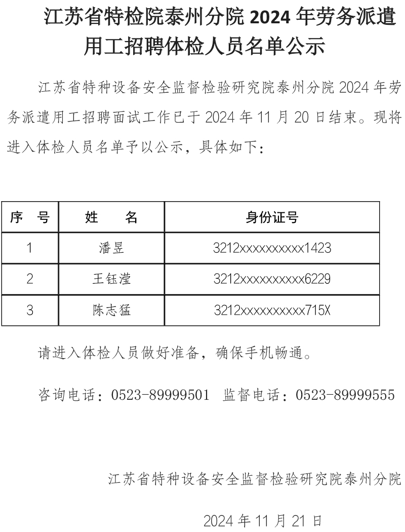 江蘇省特檢院泰州分院2024年勞務派遣用工公開招聘擬錄用名單公示